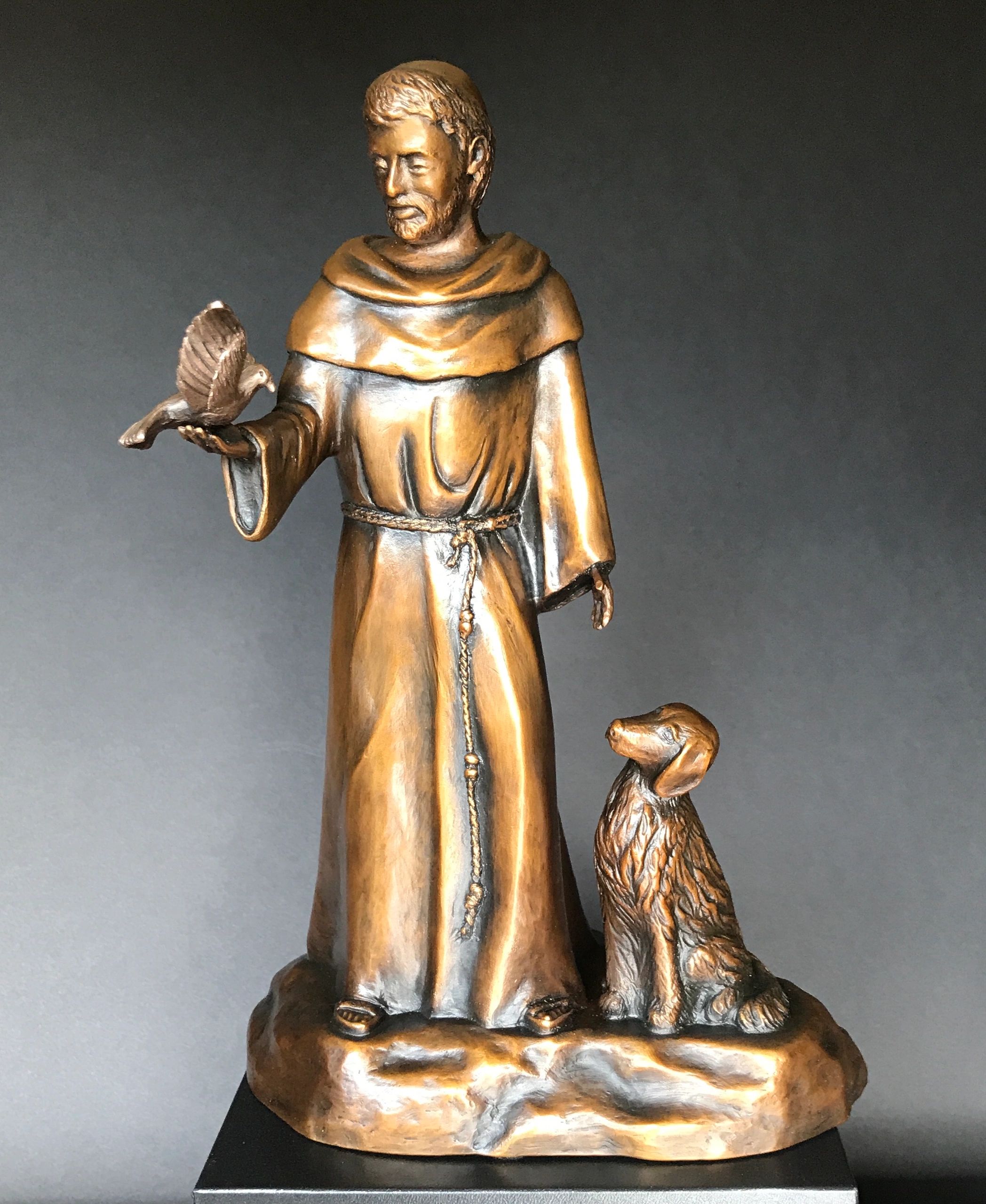This piece is St. Francis of Assisi. Well known for his devotion to all of God’s creation he is the patron saint of animals and the environment. I chose to sculpt him with an adoring dog and a bird landing on his hand.
